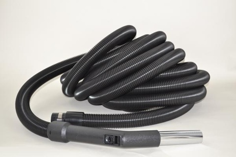 Basic central vacuum hose designed with a metal ring cuff on the end to fit 1 7/16 to 1.5 inch diameter inlet valves. If you have metal contact point inside of your inlet valve they will work turning on your built-in vacuum system. Has a bleeder control on the hose end for suction adjustment and swivels 360 degrees for easy use. Comes in a variety of hose lengths and is very high quality and crushproof.